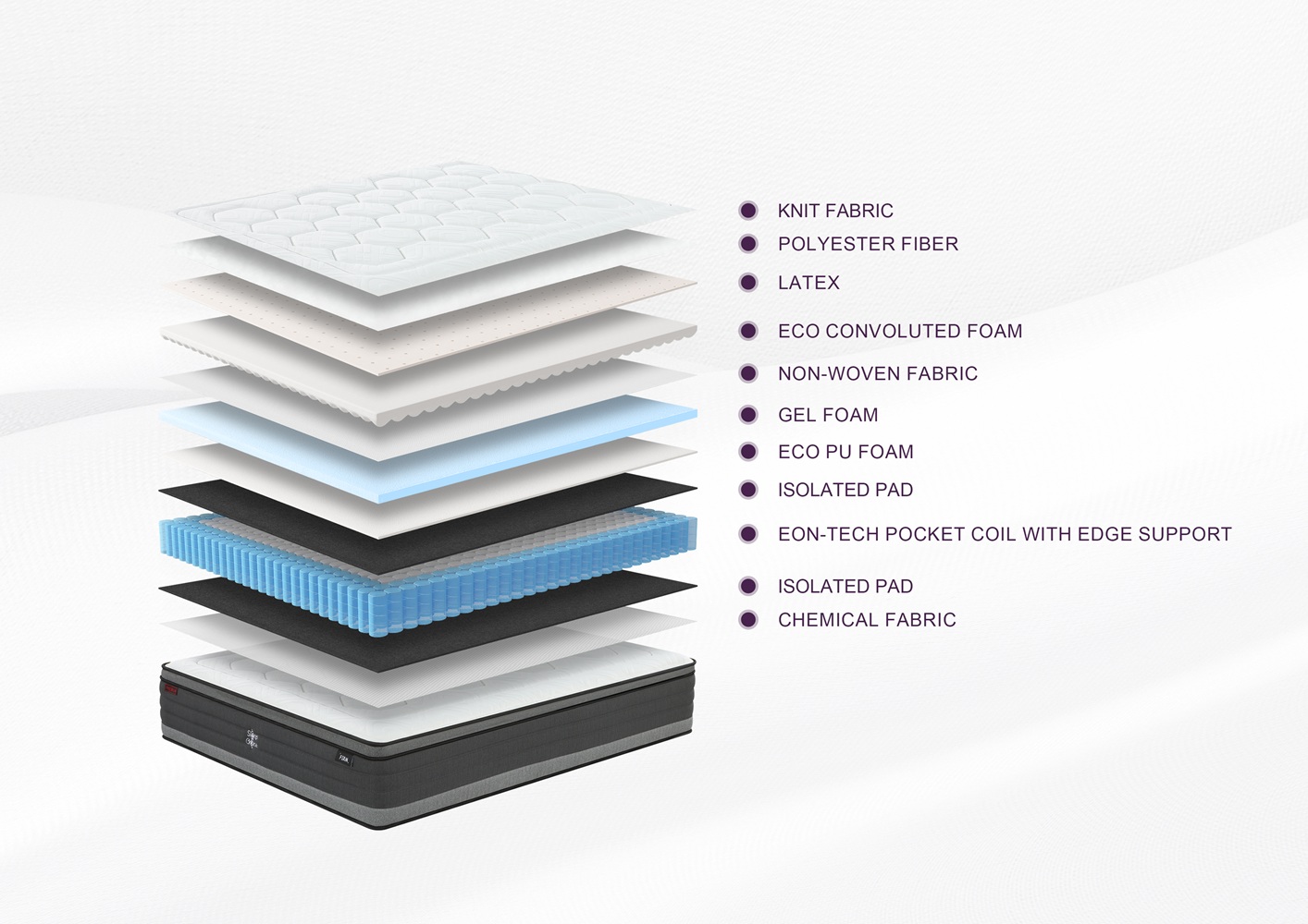 34 cm thick mattress Excellent firm support Premium knitted fabric High density 30D Eco foam layer Eon-Tech pocket spring Independent coil system 6.5 working turns coil system Hypo-allergenic material No-turn technology