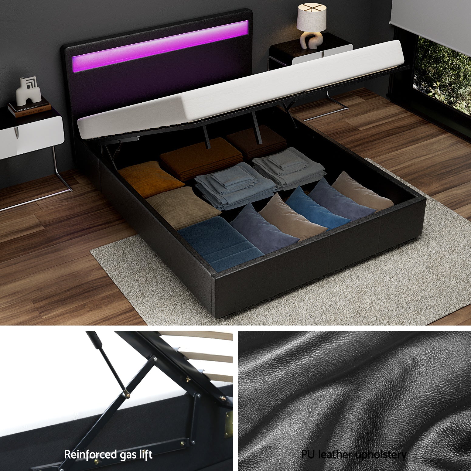 Upholstered with premium PVC leather Customisable LED light bedhead 16 LED colours 4 flashing modes Padded with high density foam Reinforced wooden construction Storage function Gas lift hinged base Smooth finish edges Heavy-duty metal connectors Sturdy legs support Easy assembly
